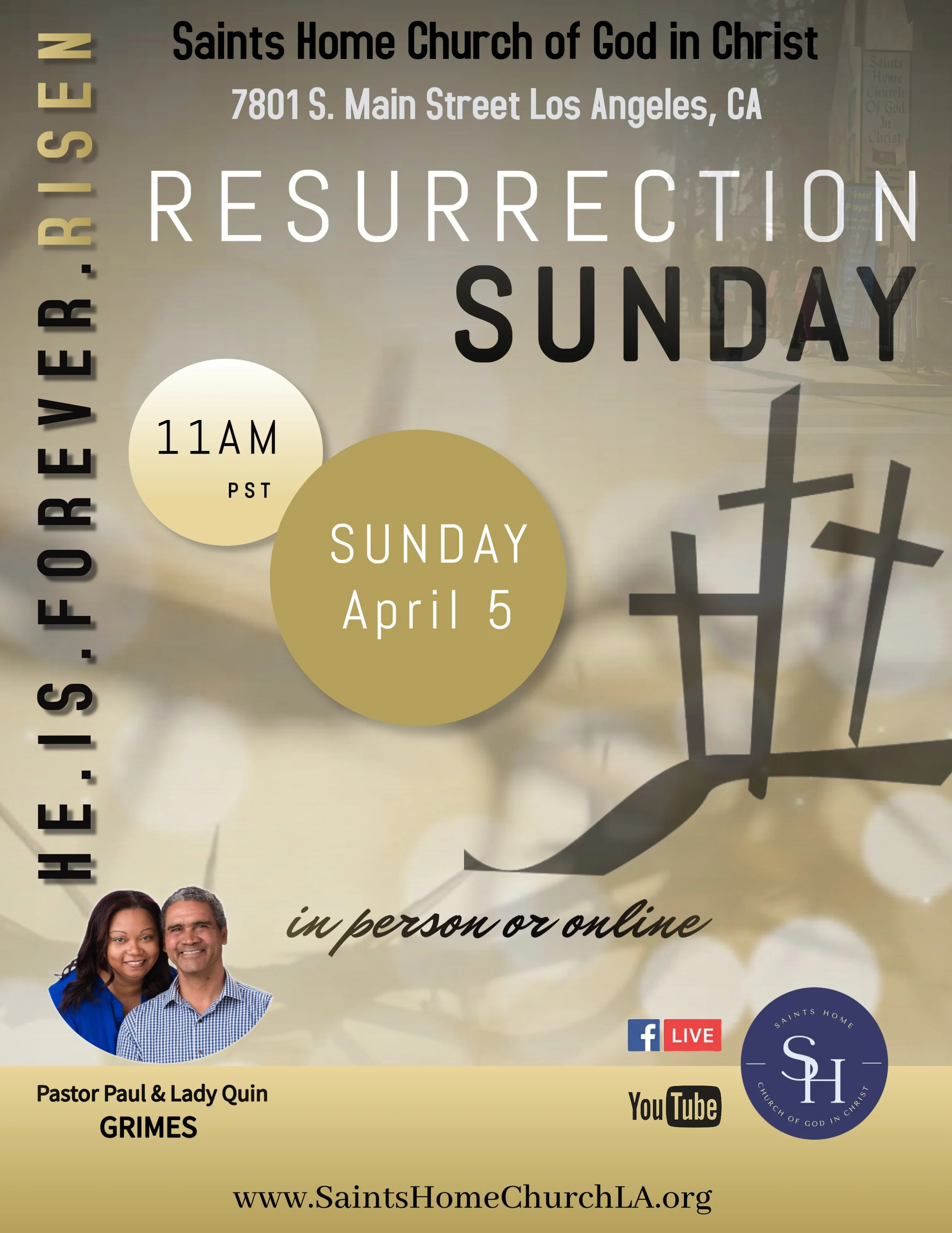 Resurrection Sunday Sunday, April 5, 2026 11:00 AM 1:15 PM 11:00 13:15 Saints Home Church of God in Christ 7801 South Main Street Los Angeles CA 90003 (map) Google Calendar ICS